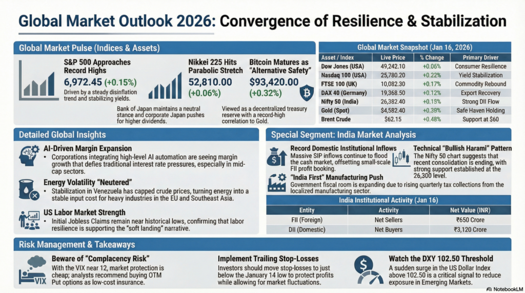 The global financial landscape on January 16, 2026, is navigating a sophisticated transition. Following a week of intensive data releases, the markets have reached an equilibrium point where cooling inflationary pressures are being met with surprisingly resilient labor statistics. Today’s primary catalyst is the finalization of mid-month positioning across institutional desks, as traders digest the implications of a “soft landing” that now seems more probable than at any point in the last 24 months. The overarching sentiment is one of “cautious optimism,” with capital flowing toward high-quality earnings rather than speculative momentum.